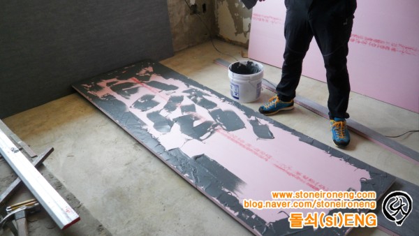 벽면에도 e-보드 부착을 위한 접착제를 바르고 있습니다.